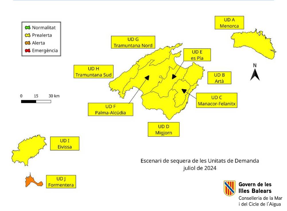 Die Grundwasserreserven auf den vier Inseln schwinden. Formentera trat im Juli in die Warnstufe Rot, alle anderen Bedarfseinheiten (UD) der Balearen stehen auf Vorwarnstufe Gelb.