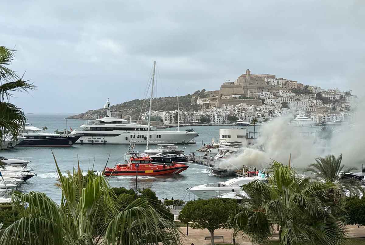 Sonntag, 5. Oktober 10.27 Uhr: Im schicken Yachthafen Marina Ibiza brennt eine Yacht. Das Feuer ist vor wenigen Minuten ausgebrochen. Noch ist die Feuerwehr nicht vor Ort. Aber die Yacht steht voll in Flammen. Es ist zu befürchten, das die Flammen auf andere Schiffe übergreifen, was eine Katastrophe wäre. Denn der Hafen ist voller Yachten und alle haben Treibstoff in den Tanks, die explodieren können. Wir halten Sie auf dem Laufenden. Foto: Jürgen Lorenz.