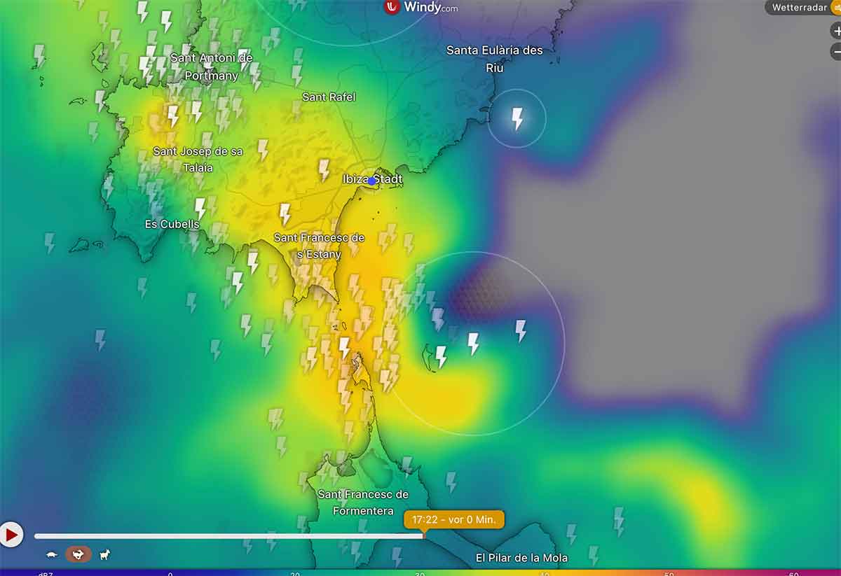 Soeben hat der balearische Katastrophenschutz vor Überschwemmungen gewarnt. Über Ibiza und vor allem über der Insel-Hauptstadt tobt ein schweres Gewitter. Große Regenmengen kommen vom Himmel und können in Kürze wieder Straßen und die Tunnel auf der Schnellstraße zum Flughafen überschwemmen. Bleiben Sie im Haus und schützen Sie ihr Eigentum.