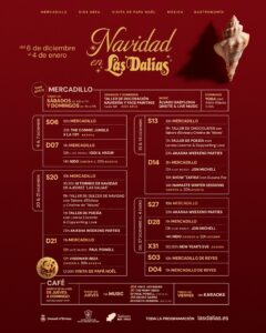 Weihnachtsmarkt im Las Dalias vom 6. Dezember bis 4. Januar Kunsthandwerk, Geschenke, Weihnachtsdekorationen, Kinderbereich, Gastronomie, Workshops, Yoga, Musik und die einzigartige Atmosphäre des Las Dalias. Samstags von 10 bis 17 Uhr