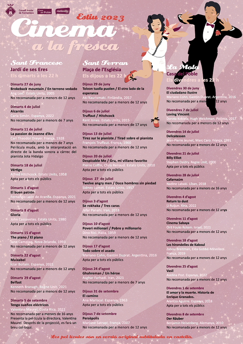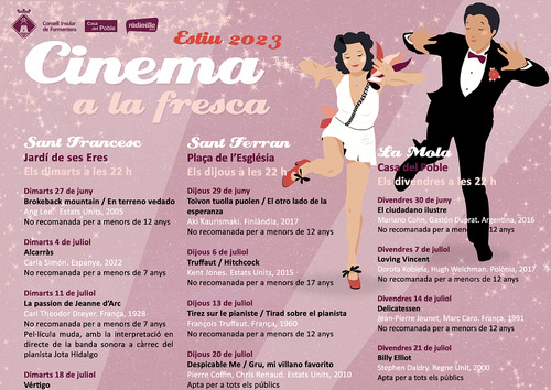 Ab heute, Dienstag, 27. Juni, bis zum 8. September laufen auf Formentera 32 spanische und internationale Filme in Freilicht-Kinos. Dienstags sind die Originalversionen mit spanischen Untertiteln in den Jardines de Ses Eres in Sant Francesc zu sehen, donnerstags auf dem Kirchplatz in Sant Ferran und freitags im Innenhof der Casa del Poble in La Mola.