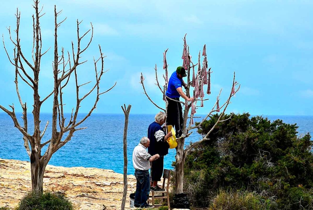 Über drei Stufen rücken auf Formentera Fischer zur Fischernte vom Baum an: Einer klettert auf den Baum, einem reicht der Stuhl und unten legt Fischer Nummer drei die Ernte in den Eimer. Natürlich wächst der Fisch auch auf Formentera nicht am Baum, sondern muss im Meer gefangen werden. Dann wird er zerlegt, gesalzen – und zum Trocknen am Baum aufgehängt. Peter Eberhardt, der das Foto an IbizaHEUTE geschickt hat, schreibt dazu: „Meist handelt es sich um Rochen oder Haie. Die Meeresbrise lässt die Fischstreifen austrocknen. Danach wird der Fisch in Olivenöl eingelegt und ist so einige Monate haltbar. Im Bauernsalat schmeckt der Fisch besonders gut.“