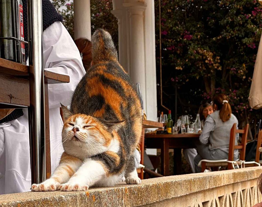 Die Sonne scheint, die Menschen sind nett zu ihr – da kann man sich als kleine Schmusekatze doch mal wohlig rekeln. So jedenfalls scheint sich die bunte halbwüchsige Katze gedacht zu haben. Sie wählte dafür die Terrassen-Balustrade des Restaurants „Can Cosmi“ in Santa Agnès. Richtig, da servieren Toni und seine Crew die wohl beste Tortilla der Insel. Dazu gehört dann der große Salat – und das Ganze zu einem fairen Preis. Inzwischen stehen aber auch andere Gerichte wie die Lammschulter aus dem Ofen auf der Speisekarte. Und weil das „Can Cosmi“ so begehrt ist, sollte man – besonders sonntags – vorher reservieren. Die Paella genossen und das Foto geschossen hat Dieter Abholte von IbizaHEUTE.