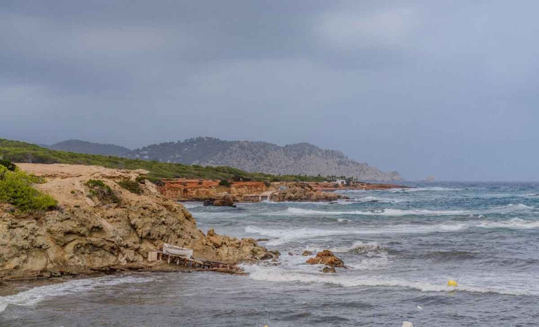 Der sonst blaue Himmel über Ibiza und Formentera wirkt grau, bleiern und drohend. Die Wellen auf dem Meer haben schon Schaumkronen und wälzen sich an den Strand und die Felsenküste. Sie sind die Vorboten, dass in großer Entfernung schon das Unwetter tobt und seine stürmischen Boten vorschickt. Die Fischer der Inseln kennen diese Vorzeichen. Sie haben ihre Boote an Land hochgezogen, sodass keine Wellen sie zerschlagen können – wie bei dem Boot rechts im Bild.