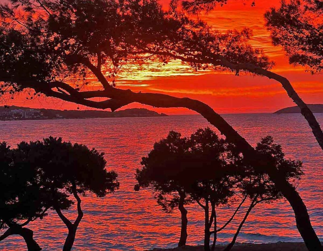 Der Himmel wirkt, als wäre er aus flüssiger Lava nach der Explosion eines Vulkans. Das tiefe Rot spielt sich im Meer. Die Bäume wirken wie Schattenrisse. So grandios können die Sonnenuntergänge vor Ibiza im Herbst und Winter sein. Man ist überwältigt von dem Zauber der Natur. Heute geht die Sonne übrigens um 19.08 Uhr unter, um am Mittwoch um 8.10 Uhr wieder aufzugehen. Dieses grandiose Foto stammt aus der Kamera von Timm Hoffmann.