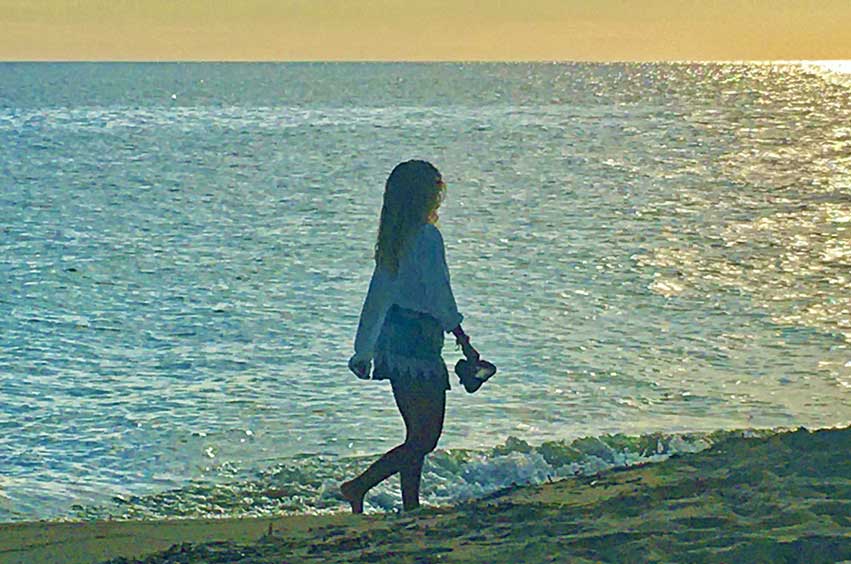 Die junge Frau, die mit nackten Füßen am Strand entlangläuft, entdeckte Peter Eberhardt mit seiner Kamera. Das Meer glitzert noch, aber der Himmel im Hintergrund hat schon den goldenen Schein des Abends. Die Strandspaziergängerin hält ihre Schuhe in der Hand. Und sie friert nicht, noch ist es angenehm von der Sonne des Tages – und das Meer um Ibiza und Formentera ist auch jetzt, Anfang November, noch über 20 Grad warm.