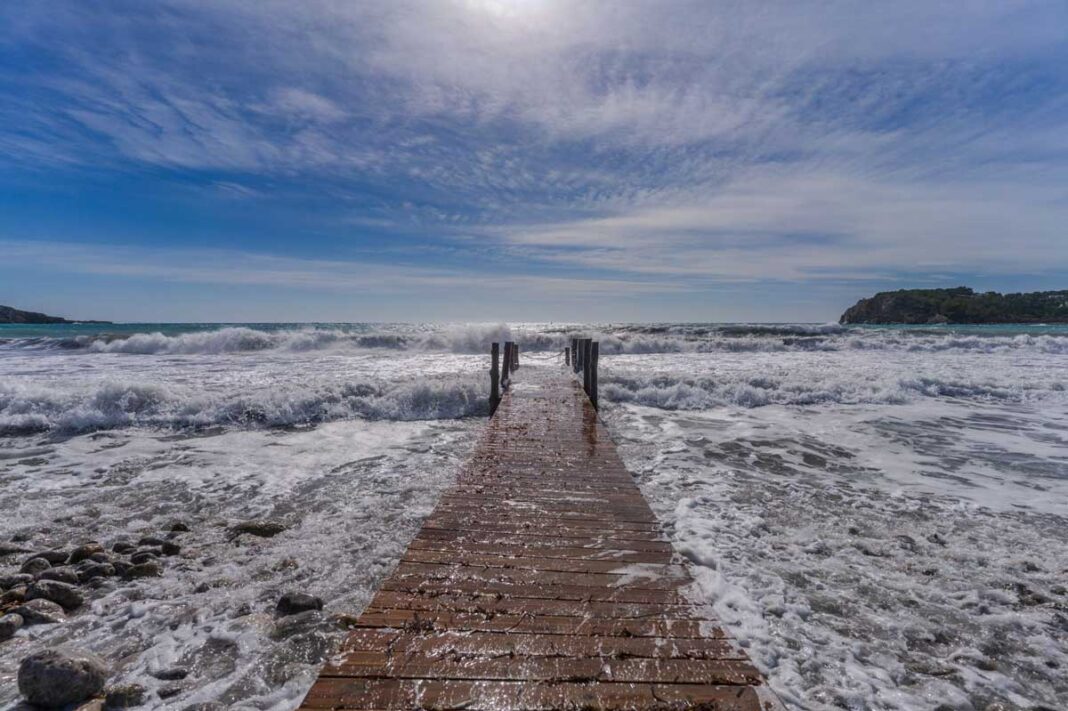 Der Himmel zeigt: Es ist Druck in der Luft – Sturm. Und der peitscht die See so sehr auf, dass die Wellen am Strand brechen. Wellen sind wie große Räder im Meer. Treffen sie unten auf ein Hindernis wie Felsen oder Sand, heben sie sich oben aus dem Wasser, steigen hoch und fallen donnernd als Brecher zusammen. Wie hier, wie sie den Bootssteg überspülen. Würden sich darauf Menschen befinden, würde die Gewalt des Wassers ihnen die Füße wegziehen und sie wahrscheinlich ins Meer ziehen oder an den Strand werfen. Bei solchem Wellengang also gilt nur eins: Weg aus der Gefahrenzone. Die dramatische Aufnahme hat Sven Oliver Puch fotografiert – und wurde nass dabei…