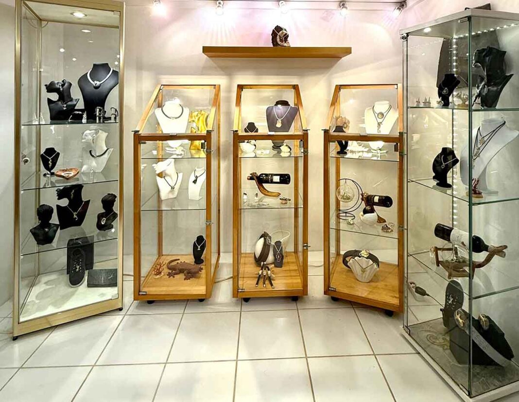 Das Atelier von Goldschmiedemeister Reinhard Maier ist klein aber fein. Hier entsteht sein besonderer Schmuck: seine Geckos aus Gold oder Silber, auch mit Brillanten, seine Ringe mit Brillanten oder kostbaren Opalen, seine Ketten mit Anhängern aus dem Meer– und immer wieder hat er überraschend neue Ideen.