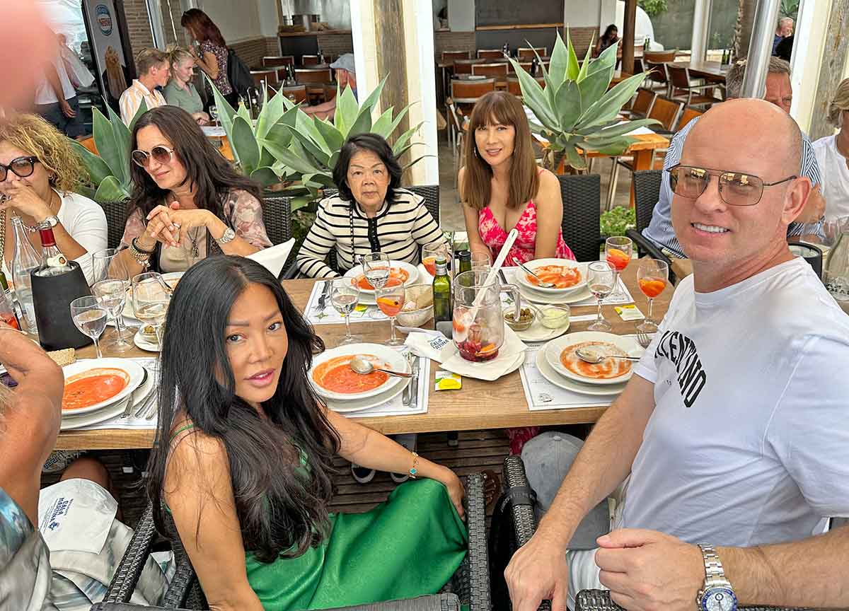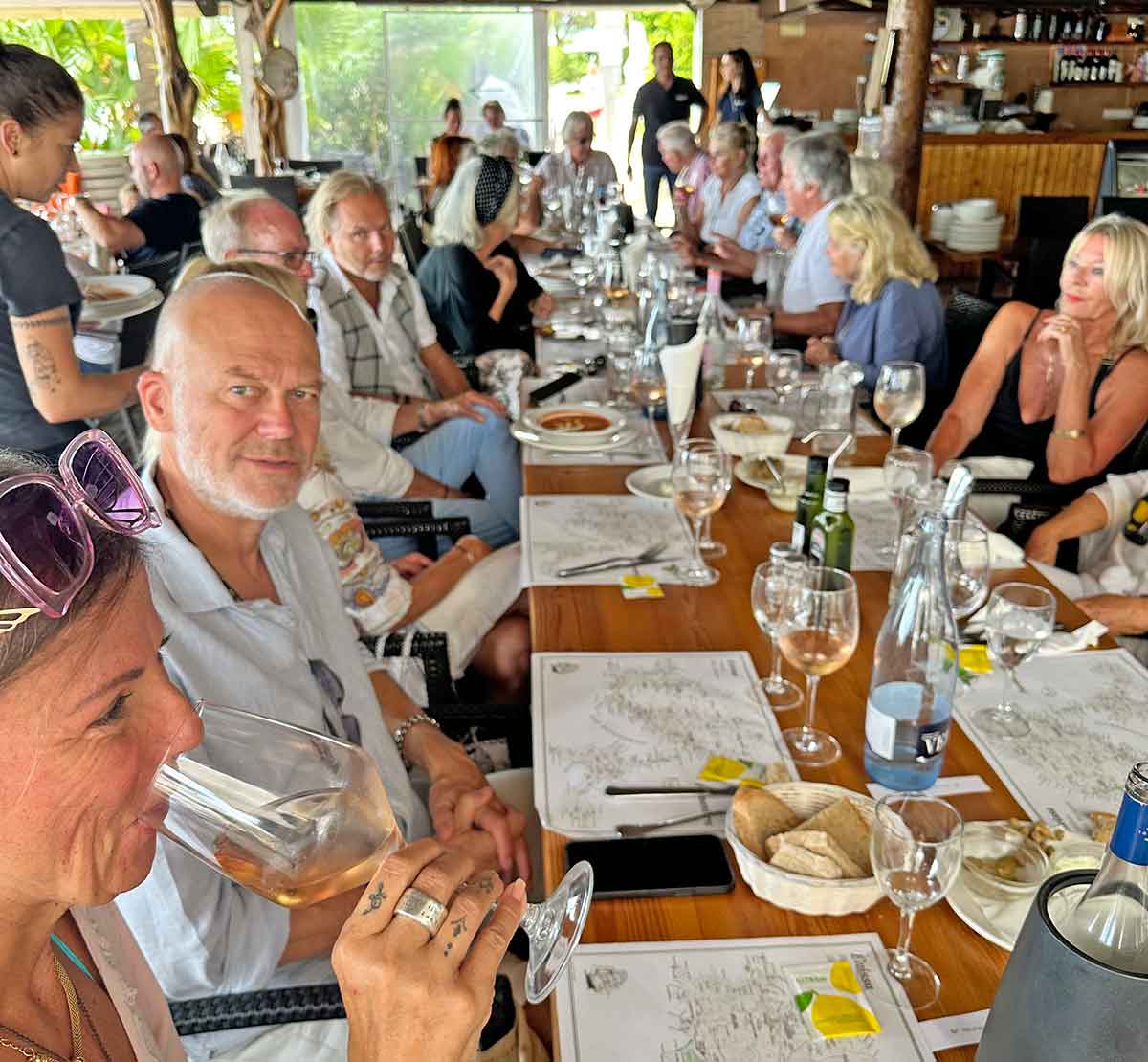Urig sollte es sein – und urig war es auch: zwei lange Tische unter dem Blätterdach und den Sonnenschirmen vom Restaurant „Cala Martina“ in der Cala Martina. Direkt am Meer und sozusagen mit den Füßen im Sand, wenn man zwei Schritte in Richtung Meer ging. Unser Drei-Gänge-Menü echt ibizenkisch: die kalte Gazpacho-Suppe vorweg, Paella aus der riesigen Pfanne oder Lubina vom Grill als Hauptgericht, Flan als Dessert danach. Dazu gab es Sangria, Wein, Bier, danach einen Kaffee.