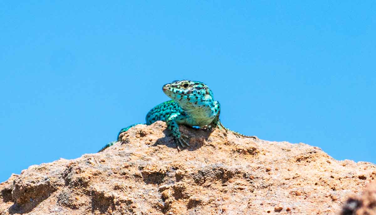 Dirk Neumeyer schickte uns dieses Foto der blauen Eidechse auf einem Felsen auf Formentera. Diese blauen Eidechsen kommen nur auf Formentera vor und werden immer seltener. Nicht zuletzt, weil Schlangen die neugierigen kleinen Drachen jagen und fressen. Ähnlich wie auf Ibiza gibt es auch auf Formentera ein Problem mit den vom Festland in Olivenbäumen eingeschleppten Schlangen. Seit der Antike waren unsere Inseln „heilige Inseln“, weil es keine giftigen Insekten und Tiere gab. Die Phönizier trugen sogar die rote Erde Ibizas in Amuletten, weil sie vor giftigen Reptilien schützen sollte. Seit der Antike und auch vorher gab es auf Ibiza und Formentera keine Schlangen – bis Gärtnereien alte Olivenbäume für die Gärten auf Ibiza vom Festland holten – und es die Behörden versäumten, diese Bäume zu kontrollieren…