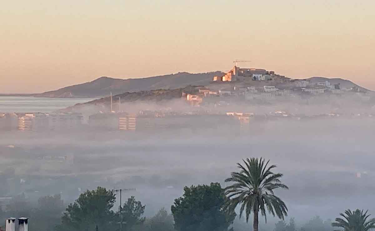 Wenn der Nebel vom Meer kommt, wirkt die Landschaft wie in Watte gepackt. Auf dem Foto von Ursula Seeliger ragt nur noch die Kathedrale innerhalb der Festungsmauern von Dalt Vila aus der Nebel-Landschaft heraus. Sie wird schon von der Sonne angestrahlt, die bald auch den Seenebel auflösen wird – und dann ist es wieder ein strahlender Tag auf Ibiza.