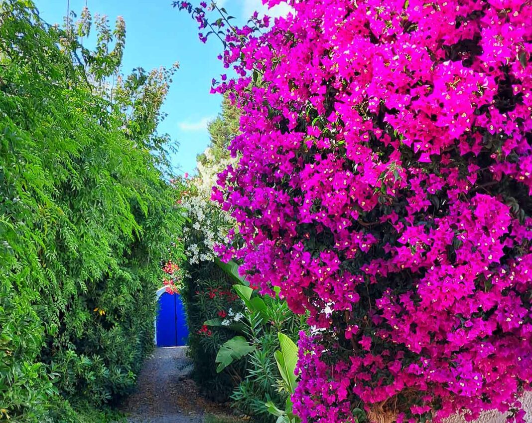 Dunja Noack schickte uns dieses Foto von der üppig blühenden Bougainvillea, die sie in Santa Eulària entdeckte. Diese roten und lila Sträucher blühen jetzt überall auf der Insel. Besonders vor den Wänden der weißen Ibiza-Häuser sehen sie toll aus. Übrigens ist das Rot keine Blüte, sondern nur der kleine helle Stempel ist es. Die roten Blätter um die Blüte sollen nur Insekten anlocken und ihnen suggerieren: Kommt her, hier wartet ein Festmahl auf euch. Und die Insekten fallen auch darauf rein…