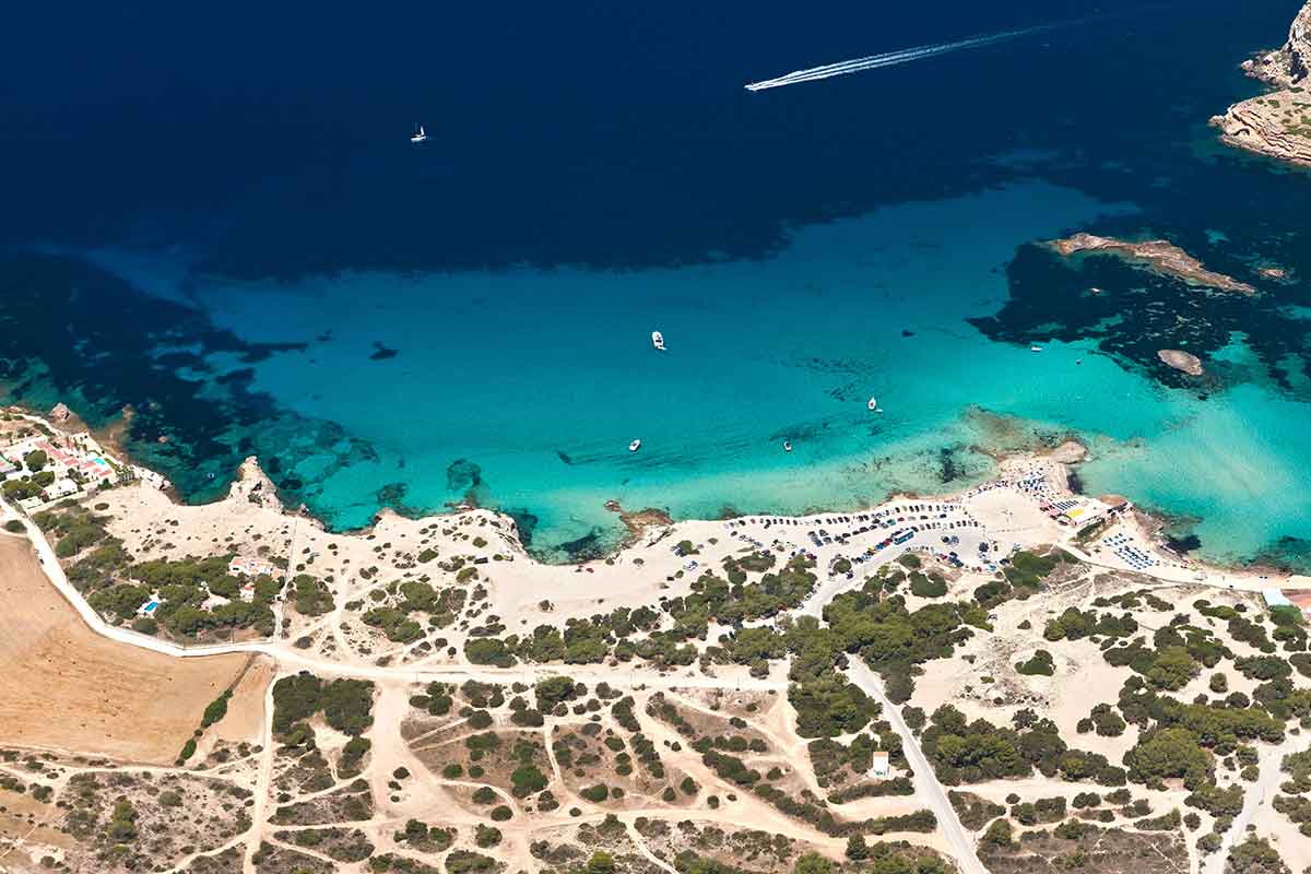 Die Cala Comte aus der Luft. Aufgenommen hat dieses Bild unser Fotograf Rüdiger Eichhorn. Er war per Sportflugzeug mit einem Piloten im Himmel über Ibiza und Formentera unterwegs und brachte spektakuläre Bilder mit. Wie dieses hier. Man sieht, wie das Meer in Ufernähe der Cala Comte dieses fantastischen Karibik-Türkis hat. Dann wird es tiefer. Das helle Blau verschwindet, weil der Untergrund nun aus Seegras und Felsen besteht. Aber das Foto zeigt, wie sauber und fantastisch das Meer um die Insel ist. Ibiza und Formentera sind Paradiese an einem paradiesischen Meer.