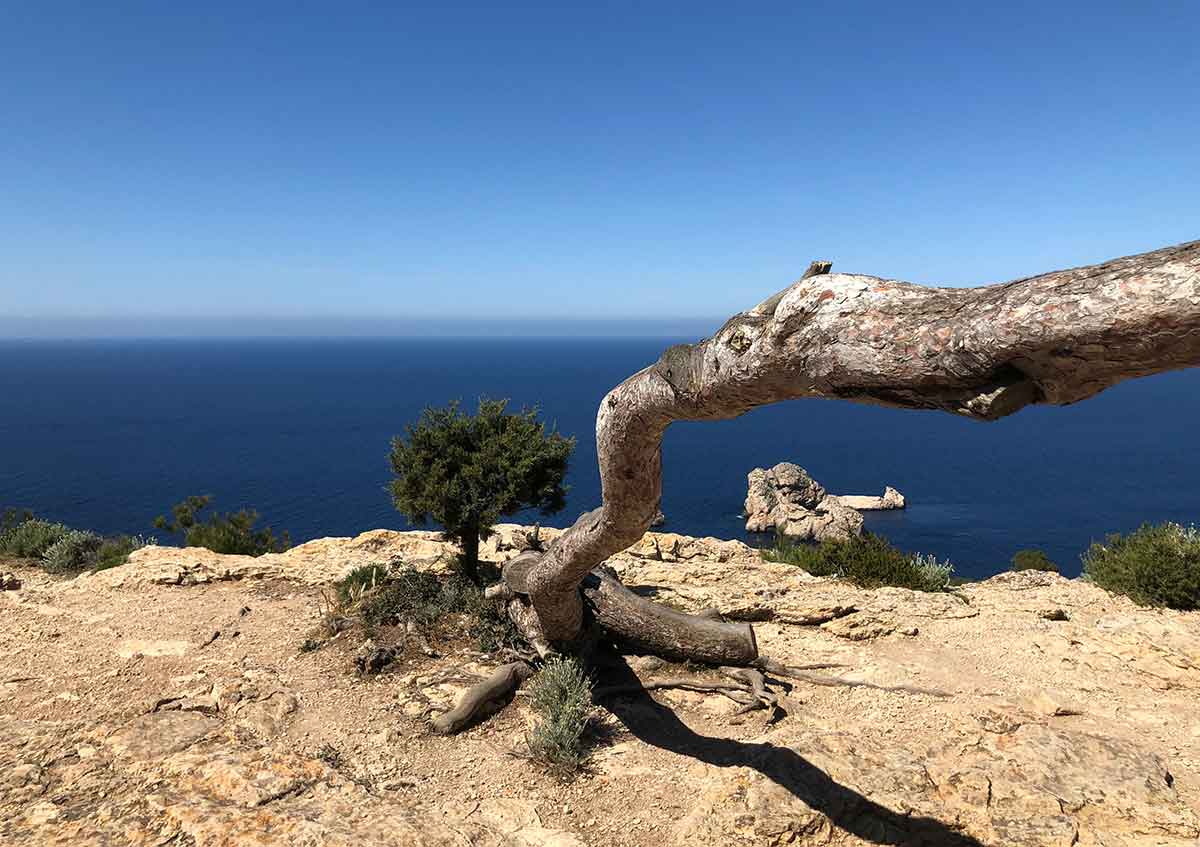 1. Die Farben. Die Dreiteilung in Himmel, Meer und Fels: Durch den makellos blauen Himmel strahlt das Meer im Hintergrund in einem tiefen Kobaltblau. Im Vordergrund gibt es nur 3 weitere Farben, das Grün der Pflanzen, der sandfarbene Fels und die helle, bräunliche Rinde des Baumstamms.