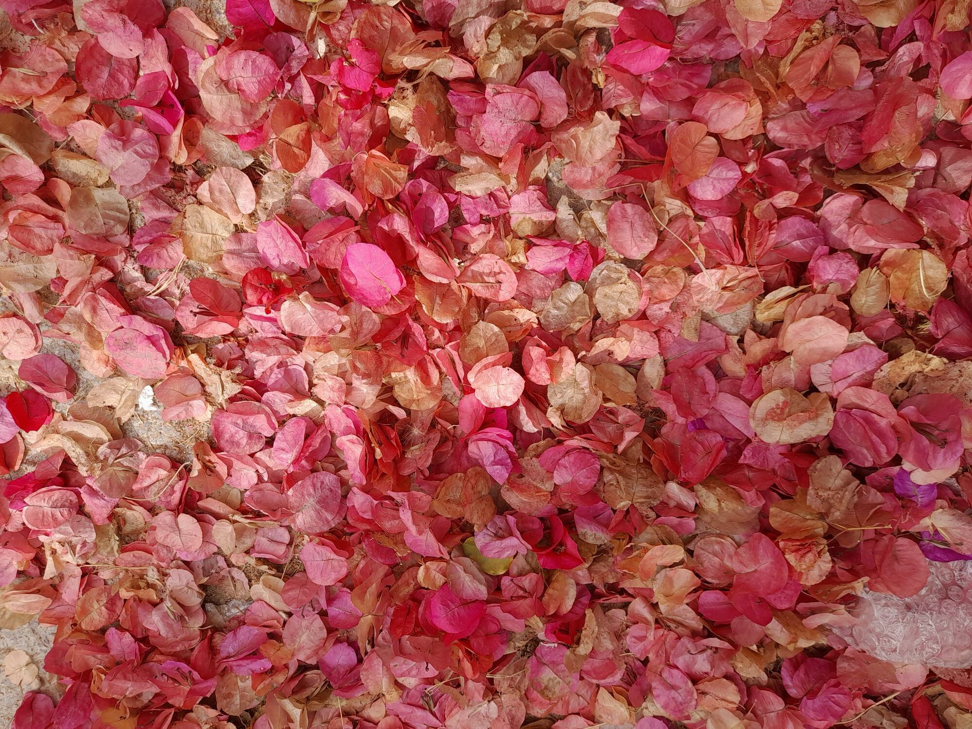 Ein Blütenmeer abgefallener Bougainvillea, das als Vorlage für ein Stoffmuster mit Ibiza-Flair dienen könnte. Das Foto schickt uns Susanne Wilhelms, die sich freut, dass „Biomüll“ so schön sein kann.