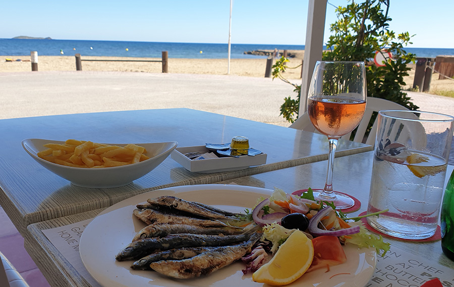 Eine Handvoll frischer gebratener Sardinen, ein Glas Wein, in dem sich die Sonne spiegelt, und ein Blick aufs ruhige Meer. Was will man mehr? So genießt Dunja Noack ihren Urlaub und lässt uns per Foto teilhaben.