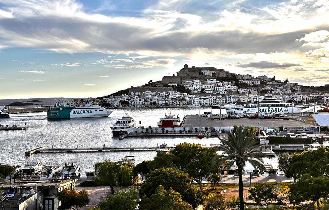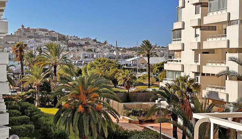 Top-Lage an der Hafenpromenade mit Blick vom vorderen Balkon auf Hafen und Altstadt, hinterer Balkon auf Pool und Hinterland. Jeweils 10 bis 15 Fußminuten vom Strand Talamanca und Hafenviertel Ibiza. Gleich neben Granhotel. Wohnung von drei Seiten offen, sehr luftig, da Endwohnung 3. Stock, natürlich Aufzüge.