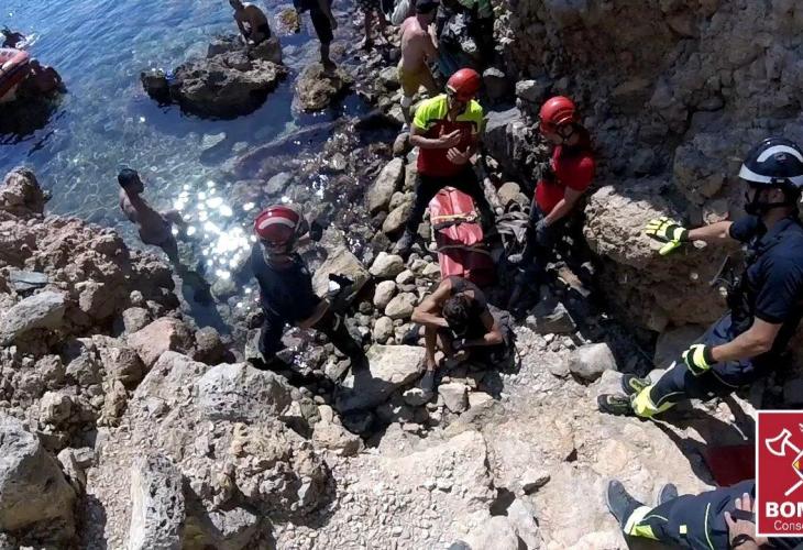 Aus der kleinen Bucht in Eivissa konnte der verletzte Mann nur im Schlauchboot gebracht werden. Foto: Bomberos de Ibiza
