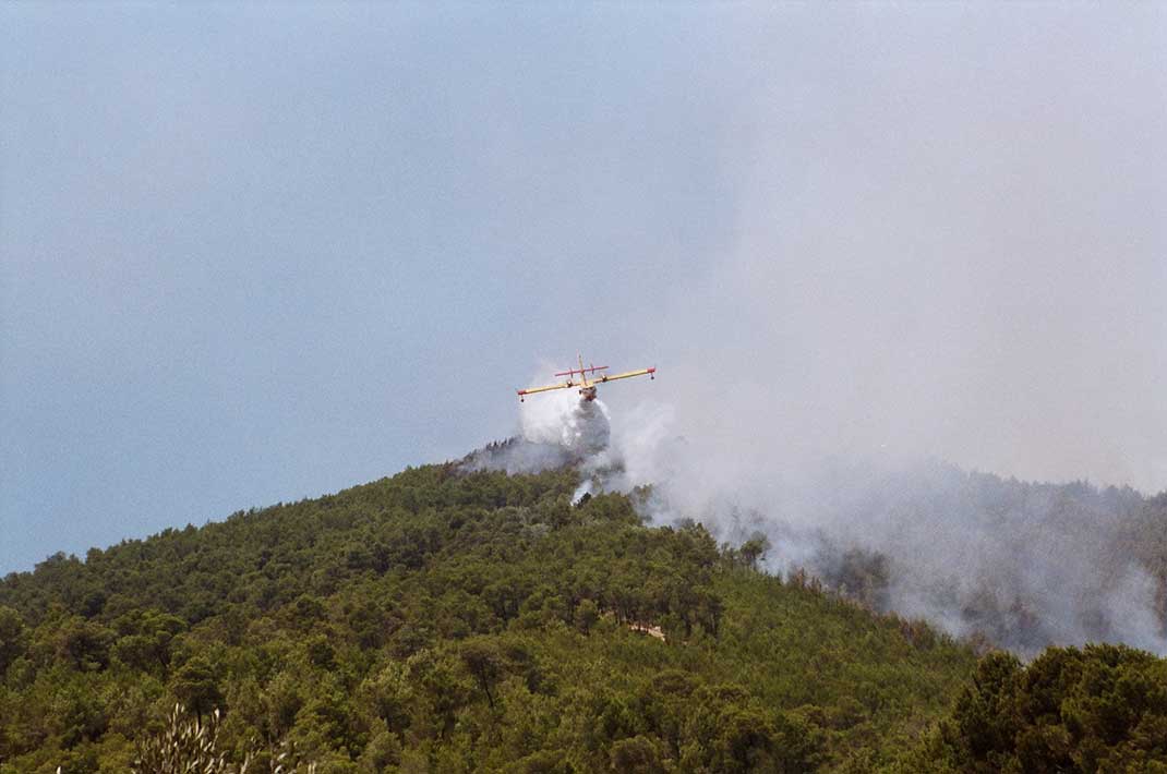 Das schnelle Vorgehen der Feuerwehr, auch dank der Kameras zur Frühwarnung, und die auf Ibiza stationierten Mittel, helfen den Bomberos, die Feuer besser zu bekämpfen. Glücklicherweise liegen die katastrophalen Großbrände auf Ibiza inzwischen viele Jahre zurück. Dieses Foto erinnert an damals, als die Löschflugzeuge im Minuten-Takt unterwegs waren.