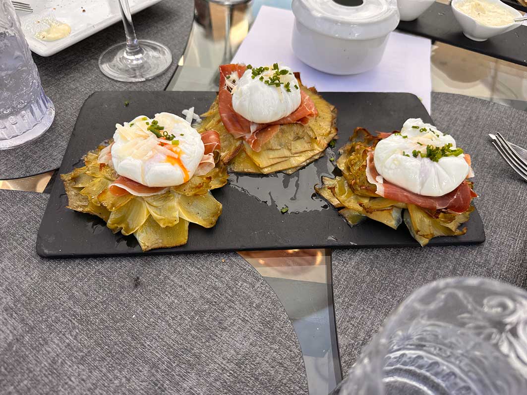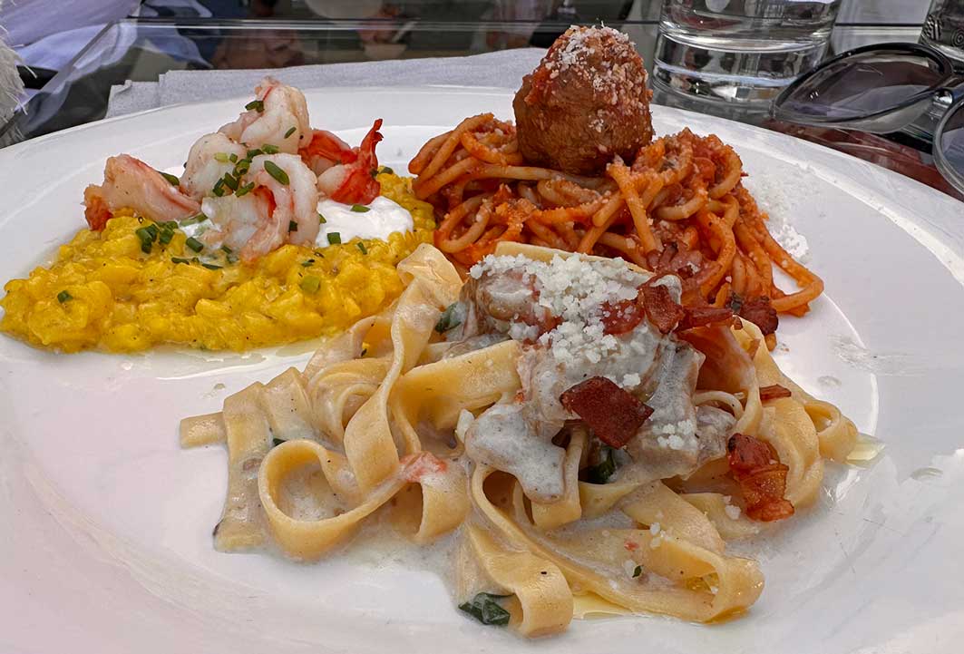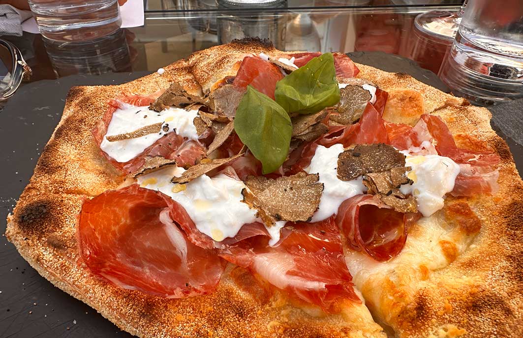 Hier die Vorspeisen, damit Sie einen Eindruck bekommen, was alles aufgefahren wurde: Roastbeef Tonnato, Mini-Tacos mit gekühltem Fleisch, panierte Garnelen, Garnelen Ghiosa, Mini-Iberische Burrata und Trüffelpizza. Wirklich: eine Pizza mit Trüffeln. Mehr italienische Spitzenküche geht eigentlich kaum.