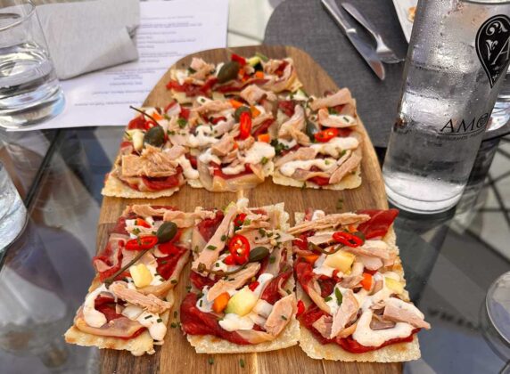 Unser letzter IbizaHEUTE-Feinschmecker-Treff unter freiem Himmel fand im Restaurant „Amore“ im Yachthafen von Santa Eulària statt. Und da zeigten die Chefs Sergio und Eliane, dass ihr Restaurant mit Recht zu den besten „Italienern“ der Insel gehört – und das schon seit vielen Jahren. Was der Sergio und seine Crew auf die festlich gedeckten Teller brachten, war einfach großartig – und ein Fest für alle Sinne. Und wie immer bei unseren Gourmet-Events im Amore war es gewaltig: ein Menü mit 5 Vorspeisen, 3 Pasta-Gerichten als Zwischengänge, ein Rinderfilet Wellington als Hauptgericht – und danach noch ein gemischtes Dessert.