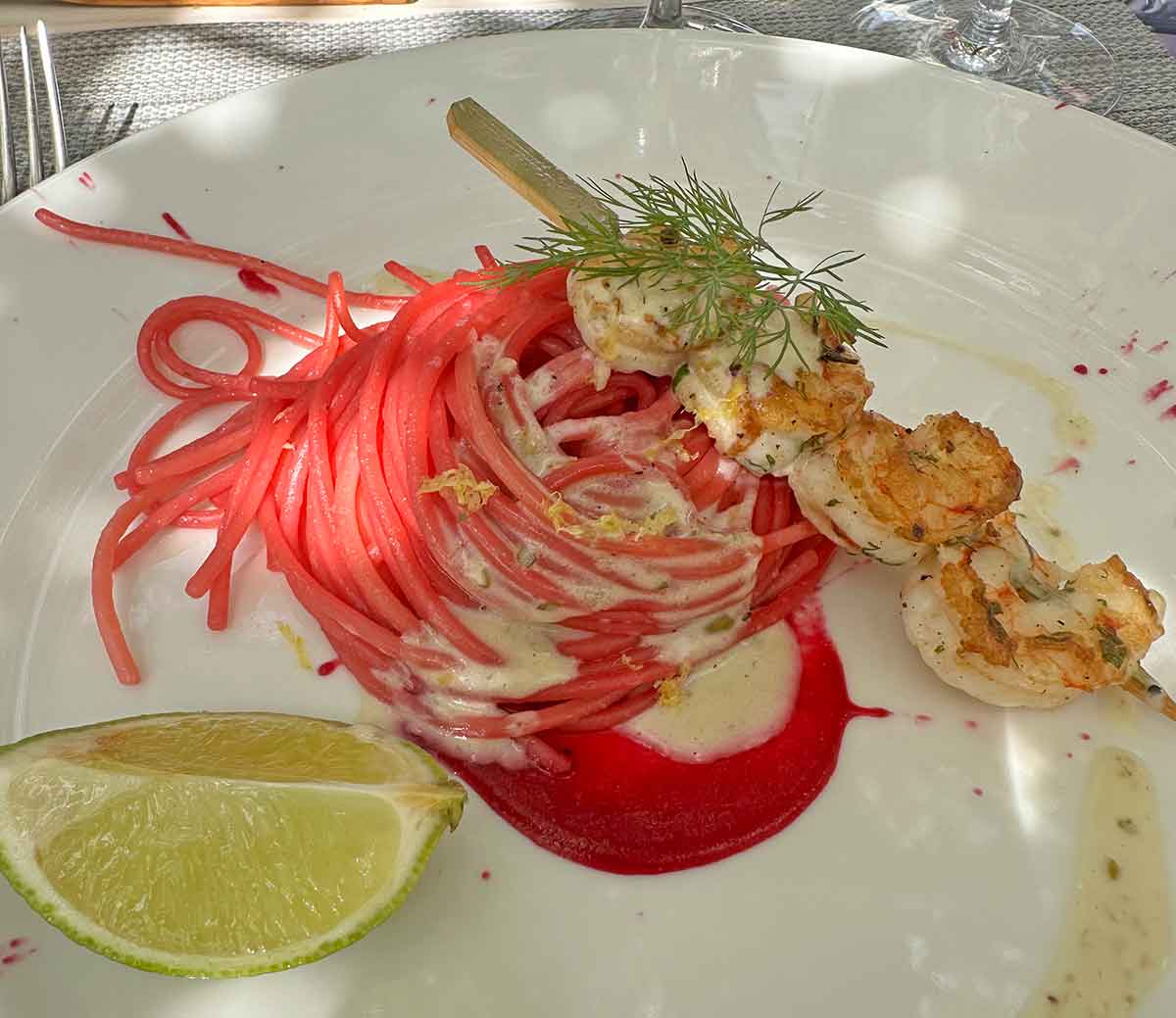 Zweiter Gang: gegrillte Garnelen auf roten Spaghetti