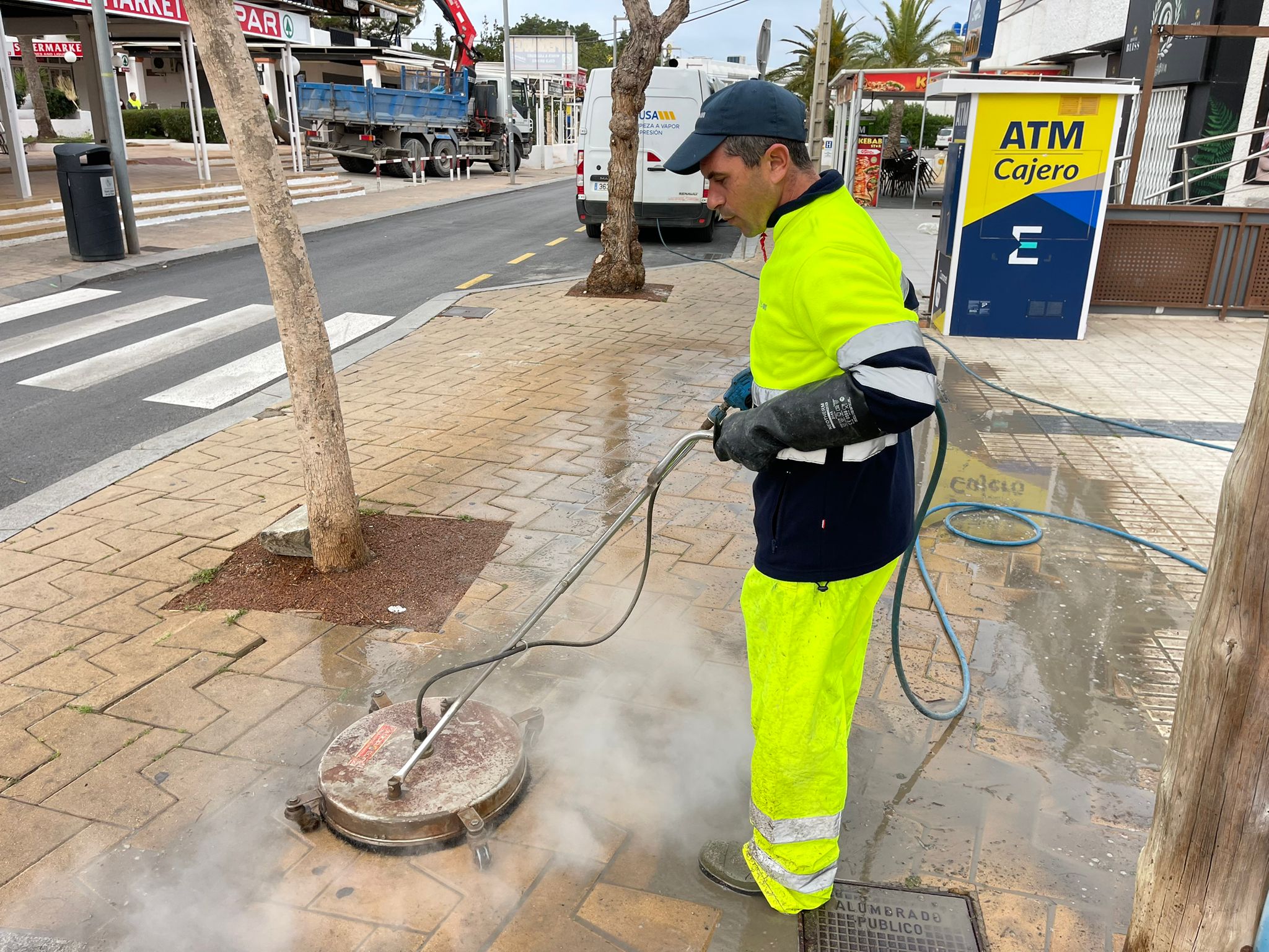 Auch Sant Josep geht gegen ungepflegte Gehwege vor. So werden in der Cala de Bou die Platten nun mit Hochdruck gereinigt. Der Dampfstrahl erreicht 160 Grad Celsius. Da putzt sich was weg. Anschließend ist die Platja d’en Bossa dran. Die beiden touristischen Ziele seien besonders verschmutzt, so die Stadträtin für Umwelt, Felicia Bocú.