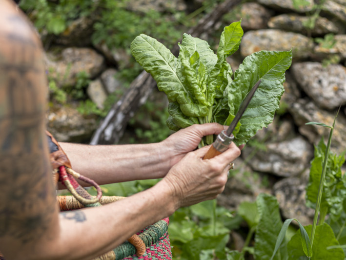 Weiter geht es ins Landesinnere. Ninas geschultes Auge erkennt sofort, wo sich essbare Pflanzen verstecken. Unser Korb füllt sich schnell: wilder Mangold, ideal für Tortillas, und wilder Spargel in mehreren Varianten.