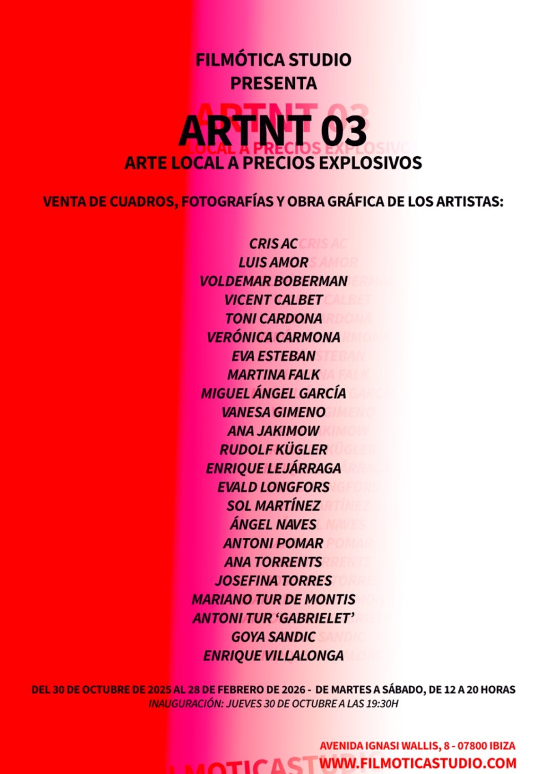 Die Galerie Filmótica Studio in Eivissa lädt am Donnerstag, 30. Oktober, um 19.30 Uhr zur Vernissage. Die Studio-Galerie von Enrique Villalonga organisiert die Gruppenausstellung ARTNT 03. Ein Wortspiel aus Kunst und Preisen, die mit TNT in die Luft gesprengt sind. Eine große Zahl von Künstlern, die sich mit Ibiza verbunden fühlen, hier leben oder gearbeitet haben, bieten ihre Werke zu erschwinglichen Preisen an.