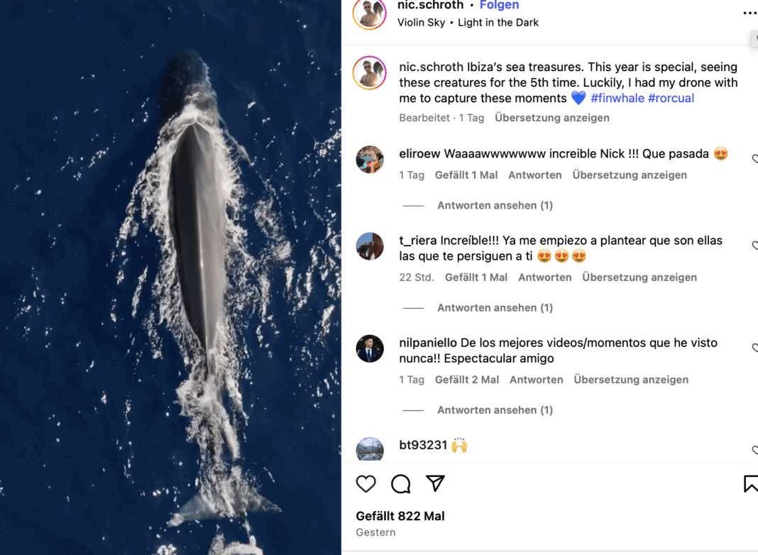 Schroth, der nach eigenen Angaben auf Ibiza aufgewachsen ist und sich dem Meer besonders verbunden fühlt, zeigte sich begeistert von der Begegnung. „Die Meeresschätze Ibizas. Dieses Jahr ist ein besonderes, wir sehen diese Tiere bereits zum fünften Mal“, schreibt er auf seinem Instagram-Account. „Zum Glück hatte ich meine Drohne dabei, um diese Momente festzuhalten.“