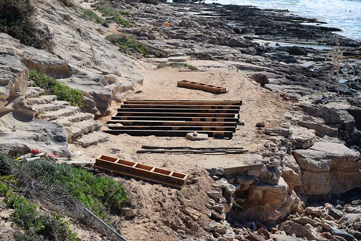 Und hier das Foto vom Strand, wo Bartolo seine Strandbude wieder aufbaut. Wo schöner, weißer, weicher Sand war, sind jetzt nur noch Felsen. Die aufgepeitschten Wellen haben den Traumstrand zerstört. Jetzt kann man nur hoffen, dass das Meer den Sand wieder anspült…