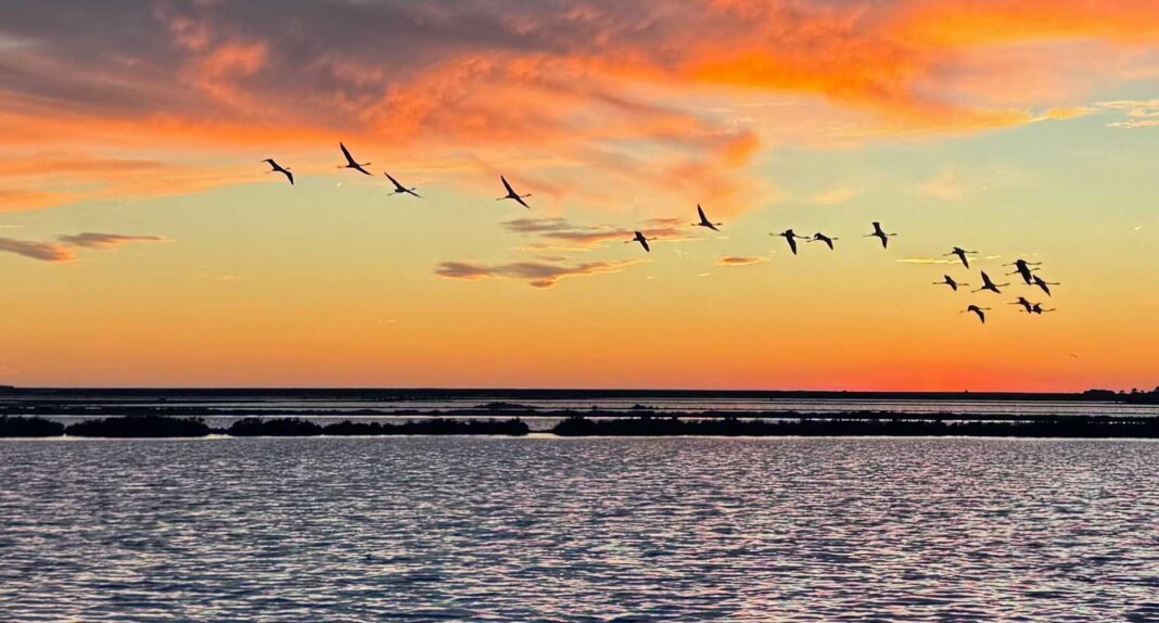 Traumwetter zum Wochenende sieht anders aus. Unser Tipp: Verlegen Sie alles, was Sie eigentlich am Sonntag im Freien oder am Strand geplant haben, auf den heutigen Samstag. Denn der ist wettermäßig noch okay: ein Mix aus Sonne und Wolken, bis 22 Grad im Schatten, mäßiger bis böiger Wind aus Südwest. Vielleicht sogar mit einem solch traumhaften Sonnenuntergang über den Salinen, wo die Flamingos majestätisch über den Abendhimmel fliegen. Das fantastische Foto hat Steffen Brill uns als Foto des Tages geschickt. Er schrieb dazu: „Es war ein wunderschöner Abend in den Salinen.“