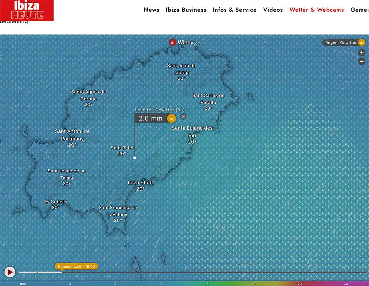 Der spanische Wetterdienst sieht auch heute und am morgigen Freitag die Gefahr. Ein anderer Wetterdienst sieht diese Gefahr nicht. „Windy“, ein spezieller, sehr genauer Service für Schifffahrt, Segler, der auch im Mittelmeer punktgenau arbeitet – er berechnet sogar die unterschiedlichen Regenmengen zwischen Ibiza und Santa Eulària oder Sant Josep –, sieht diese Gefahr nicht. Er sagt für Ibiza nur leichte Gewitter mit mäßigem Regen für heute und morgen voraus. Hoffen wir, dass „Windy“ recht hat. Sie können diesen speziellen Wetterdienst jederzeit bei uns auf IbizaHEUTE-Online einsehen. Unter der Rubrik „Wetter & Webcams“. Hier ist der Link: windy
