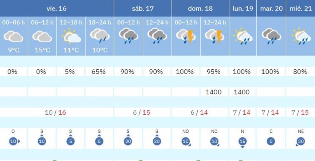 Es bleibt Freitag bei 16 Grad Celsius tagsüber, Samstag bei 15 und dann 14 Grad. Nachts kühlt es auf 10 Grad, Samstag und Sonntag auf 6 und ab Montag auf 7 Grad ab. Schwacher Wind aus Süden, ab Sonntag aus Norden und wechselnd. Es ist gut möglich, dass der Regen bis Donnerstag oder sogar Freitag anhält.